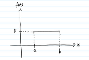 임의의 시간에 나가는 것이므로 모든 확률은 같습니다. 그런데 X는 셀 수 없는 변수입니다. 연속확률변수입니다. 셀 수 없다는 것은 단순히 그 개수가 무한개라는 것이 아닙니다. 자연수도 개수가 무한개지만 셀 수 있습니다. 1다음에 오는 것이 2입니다. 그런데 위 예제에서 0분 다음에 오는 것이 뭘까요? 0.1분? 0.001분? 셀 수 없습니다. 연속확률변수이기 때문에 함수 값은 확률이 아니라 확률밀도입니다. 이 확률밀도를 일단 k라고 놓고 그래프를 그려봅시다.